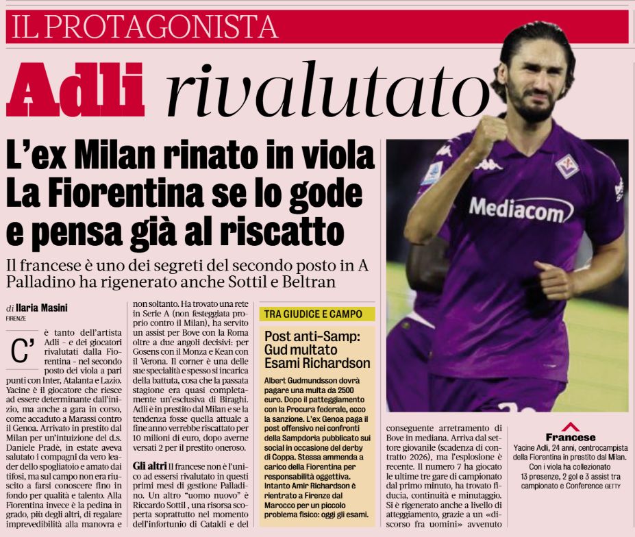 Gazzetta dello Sport (seen below) write that the midfielder has been ‘revalued’ in Florence, and the fans already love him. He is ‘a pawn more capable than others’ in Raffaele Palladino’s team, and if trends continue then he would be purchased at the end of the season for €10 million.
