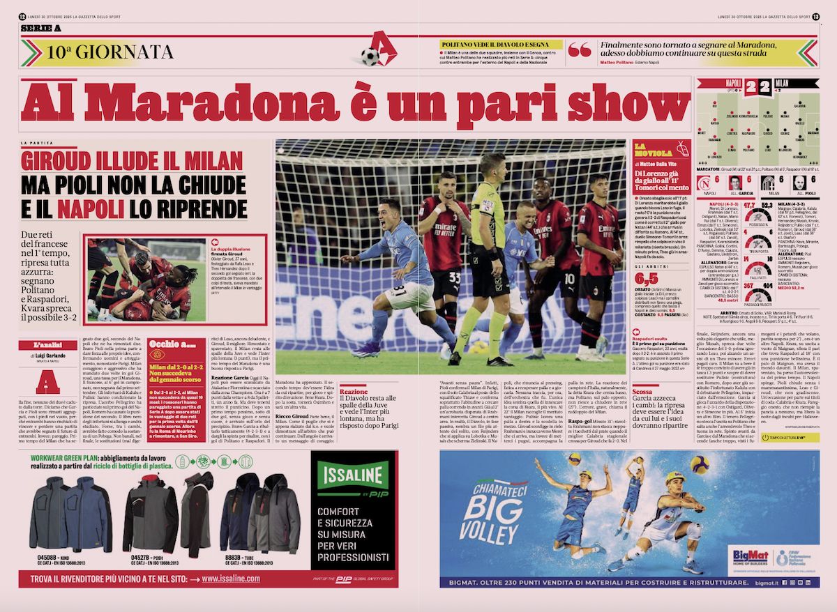 The first half was Milan’s as they scored two goals, the second was Napoli’s who produced an impressive comeback. Pioli deserves praise for sticking to his ideas in the opening 45 minutes, showin faith in his men and his style despite the 3-0 loss in Paris.