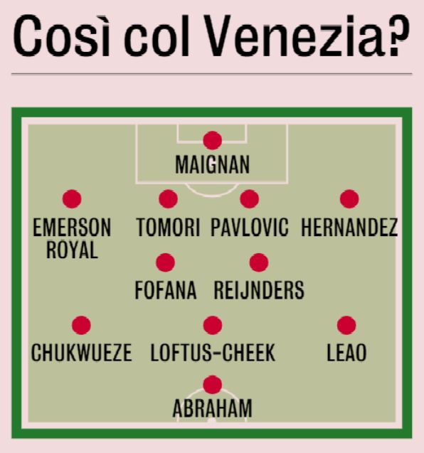 Probable Milan XI (4-2-3-1): Maignan; Emerson Royal, Tomori, Pavlovic, Hernandez; Reijnders, Fofana; Chukwueze, Loftus-Cheek, Leao; Abraham.