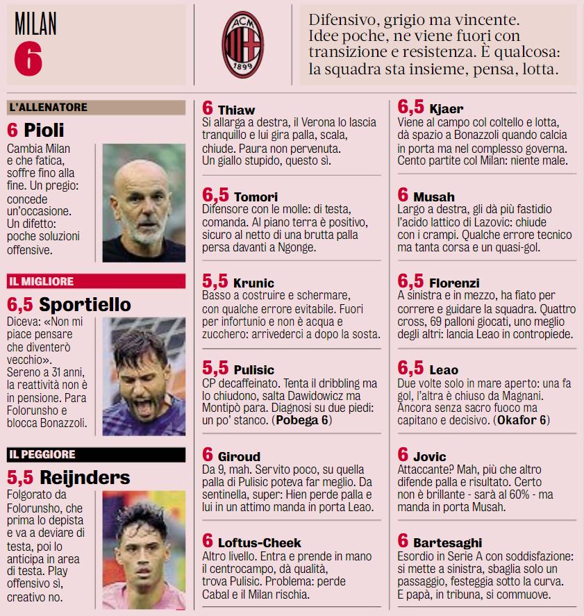 As per today’s edition of Gazzetta Dello Sport (see photo below), the best was not the winger but rather Marco Sportiello. He made a great reflex save in the first half and was named the MOTM with a 6.5/10, the same rating as Simon Kjaer, Fikayo Tomori, Alessandro Florenzi and Leao.