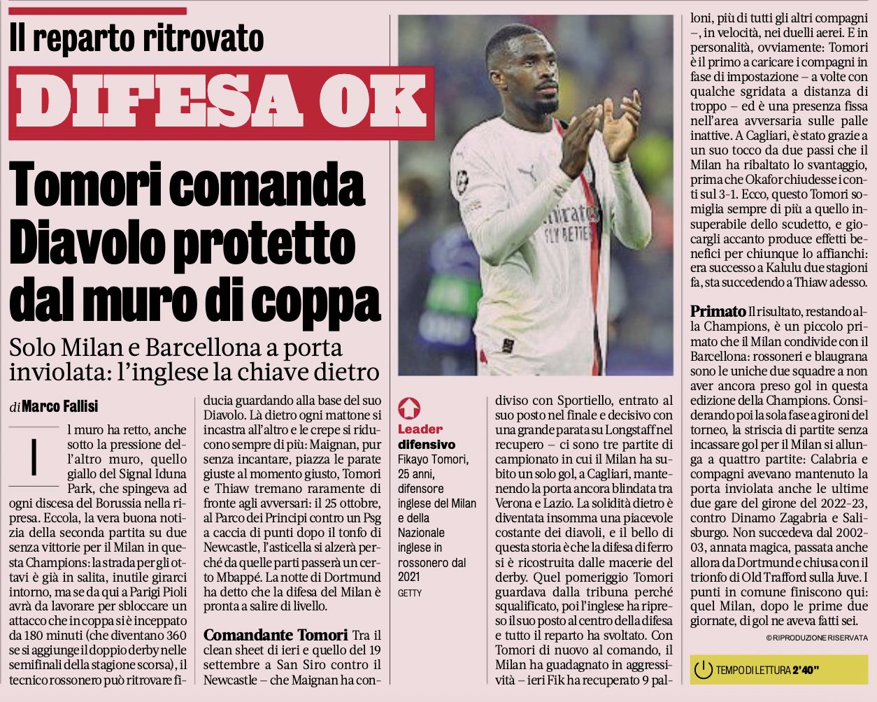 The night in Dortmund said that Milan’s defence is ready to level up. Between yesterday’s clean sheet and that of 19 September at San Siro against Newcastle – which Maignan shared with Sportiello, who came on in his place – Milan conceded one goal across three league games.